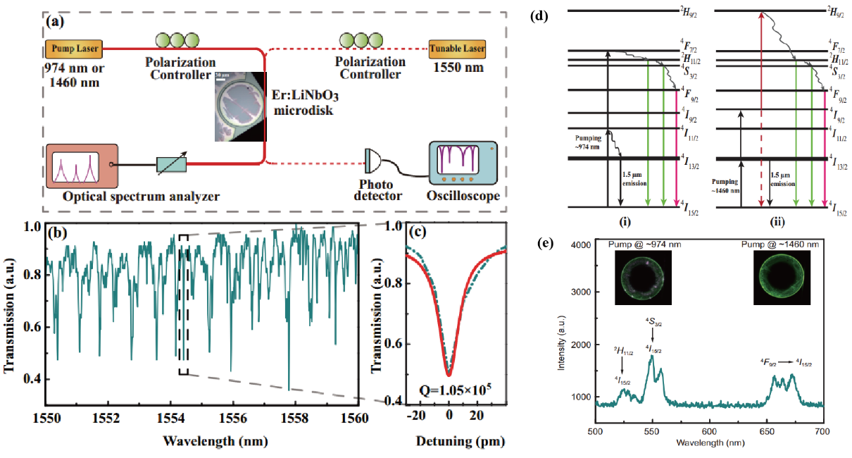 图1. (a)微盘腔激光器实验装置;(b)掺铒铌酸锂微盘腔在通信波段的谐振模式;(c)腔模式的品质因子;(d)铒离子能级系统;(e)两种泵浦源产生的多波长激光辐射