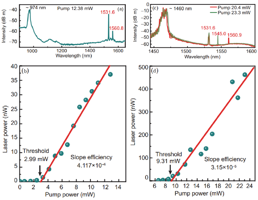 图 2. (a), (b) 974nm泵浦源的激光输出波长和激光阈值;(c), (d) 1460nm泵浦源的激光输出波长和激光阈值