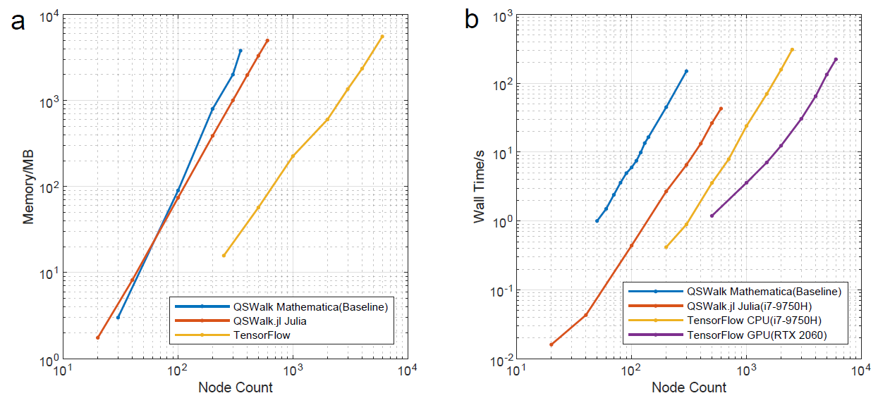金贤敏、唐豪课题组经过反复研究论证,采用Runge-Kutta数值方法,使得空间资源的量级从节点数的4次方降为2次方,同时采用TensorFlow 进行GPU并行计算,明显地缩小了计算的时间量级。与目前常用的QSWalk软件求解同一个1000节点Erdos-Renyi网络的量子网页排序,本TensorFlow求解器仅需内存226MB及用时3.6s,分别仅为QSWalk的0.2%和0.05%。在笔记本电脑常见的6GB显存(RTX 2060 GPU)上可以完成高达6000节点网络的量子网页排序,而此前计算150-200个节点就将耗尽该电脑内存。这个突破极大地方便未来的相关研究。