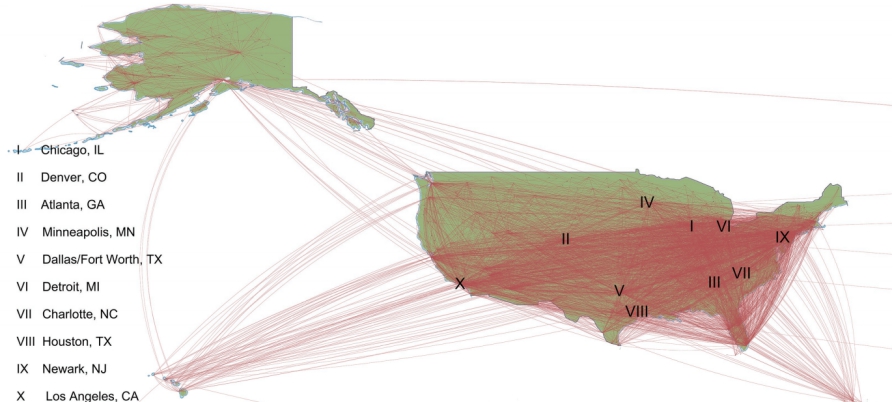 在开发出了这款求解器后,团队又进一步在两个不同的场景应用了这一模拟器。第一个场景是在美国的航空网络中(922节点)进行QPR,这一模拟器的结果显示了QPR能更好地突出次级枢纽,并能对不同的节点给出更具差异化的结果,验证了前人的结论。