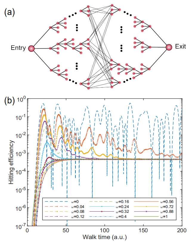 图4 (a)层数为6,分叉数为3的粘合二叉树,共计有2186个节点(b)不同ω下到达效率随时间的变化关系。