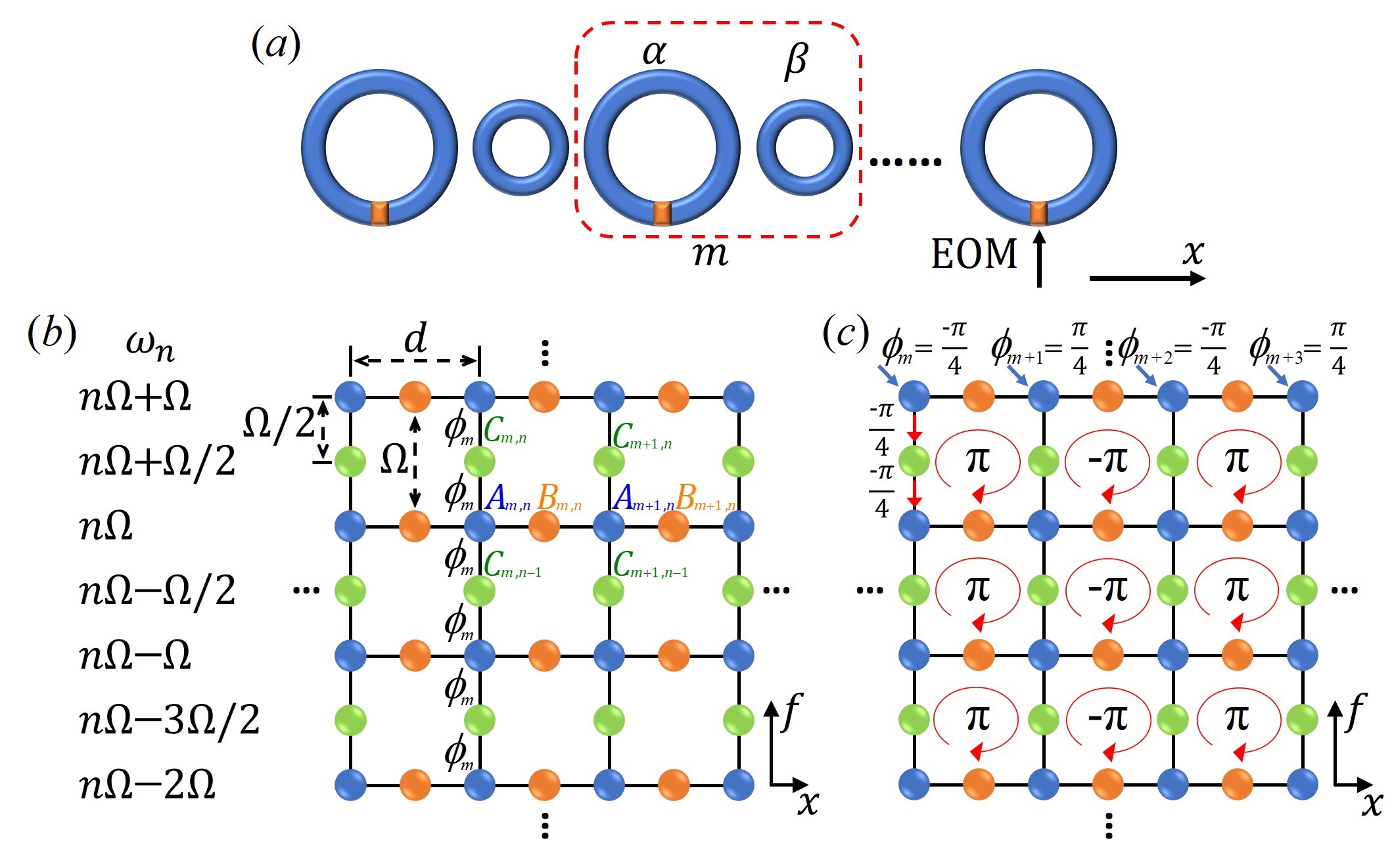 (c)光电调制器(EOM)产生相位差使光子晶格产生等效磁场。