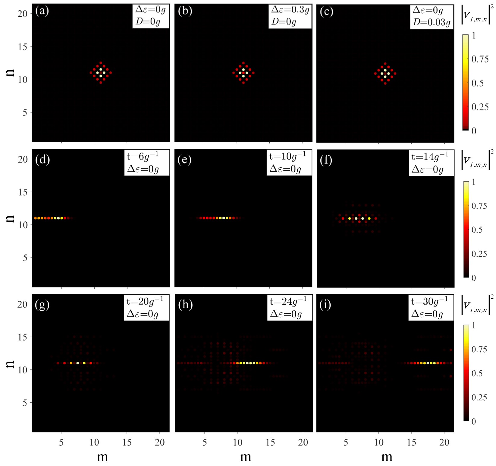 本文研究了利用谐振环系统产生含频率维度的合成空间(图一(a)),设计合适的谐振频率间隔和光电调制器的调制频率构造出合成空间中的类Lieb晶格(图一(b))。利用光电调制器产生的相位差,从而使合成空间中的Lieb晶格受到等效磁流的效应(图一(c))。Lieb晶格本身的能带结构中含有平坦能带,但是Lieb晶体在未受磁流效应时,光场由平带所导致的局域效应会被外加的干扰所破坏,这不利于光子的存储和传输。在本文的设计中,利用光电调制器产生等效磁流从而使类Lieb晶格的能带结构中的平带和色散能带分离,从而产生了很好的光场局域效应。论文中模拟了光场的局域效应(见图二(a)-(c))以及光波的传播控制(见图二(d)-(i))。