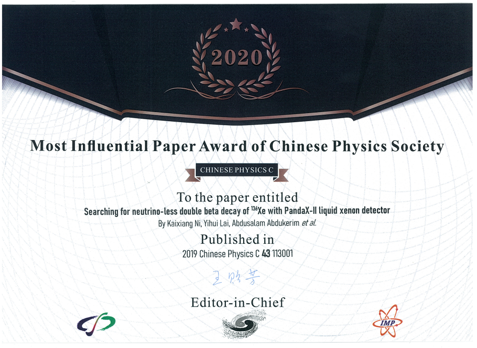 近日“中国物理C”杂志公布2020年度中国物理学会最具影响力论文奖,PandaX合作组文章“Searching for neutrino-less double beta decay of Xe-136 with PandaX-II liquid xenon detector“成功入选。
