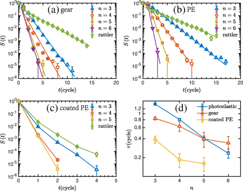 张洁课题组发现,在循环剪切驱动下的二维颗粒体系,其中的元胞序(cell order)遵循指数分布。这种指数分布在从弱摩擦到强摩擦系统中都可以观察到,并且可以用玻尔兹曼分布进行解释。这种玻尔兹曼分布可以理解为在颗粒体系中,元胞的位型熵与稳定性竞争,且熵占有主导地位的结果。他们通过对比发现,这种竞争关系由颗粒摩擦系数所调控。最后,该项研究发现了元胞快速演化的性质,揭示了颗粒体系类似于液体的性质。