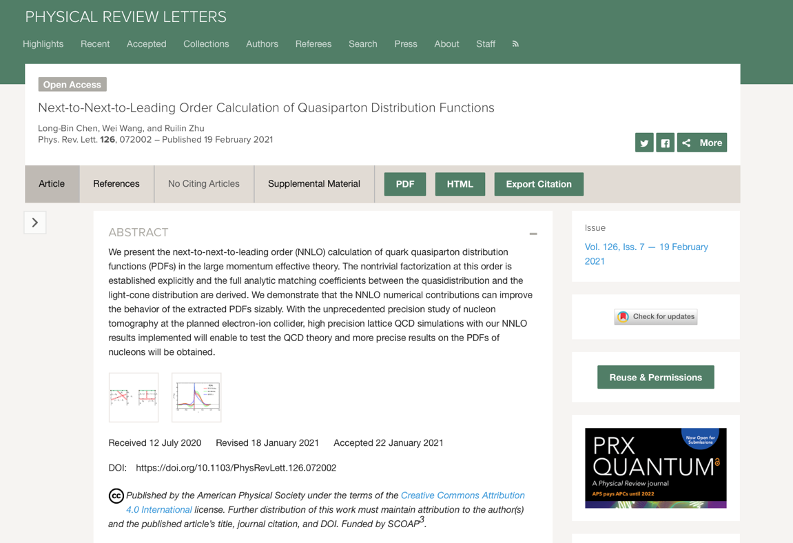 王伟与合作者在两圈水平下计算了夸克的准分布函数,在次次领头阶水平下验证了大动量有效理论的因子化公式,并得到了次次领头阶匹配系数的解析表达式。结合格点量子色动力学的计算,获得了模型无关的夸克部分子分布函数。这些结果对于第一性原理出发理解核子内部结构特征有重要的科学意义。