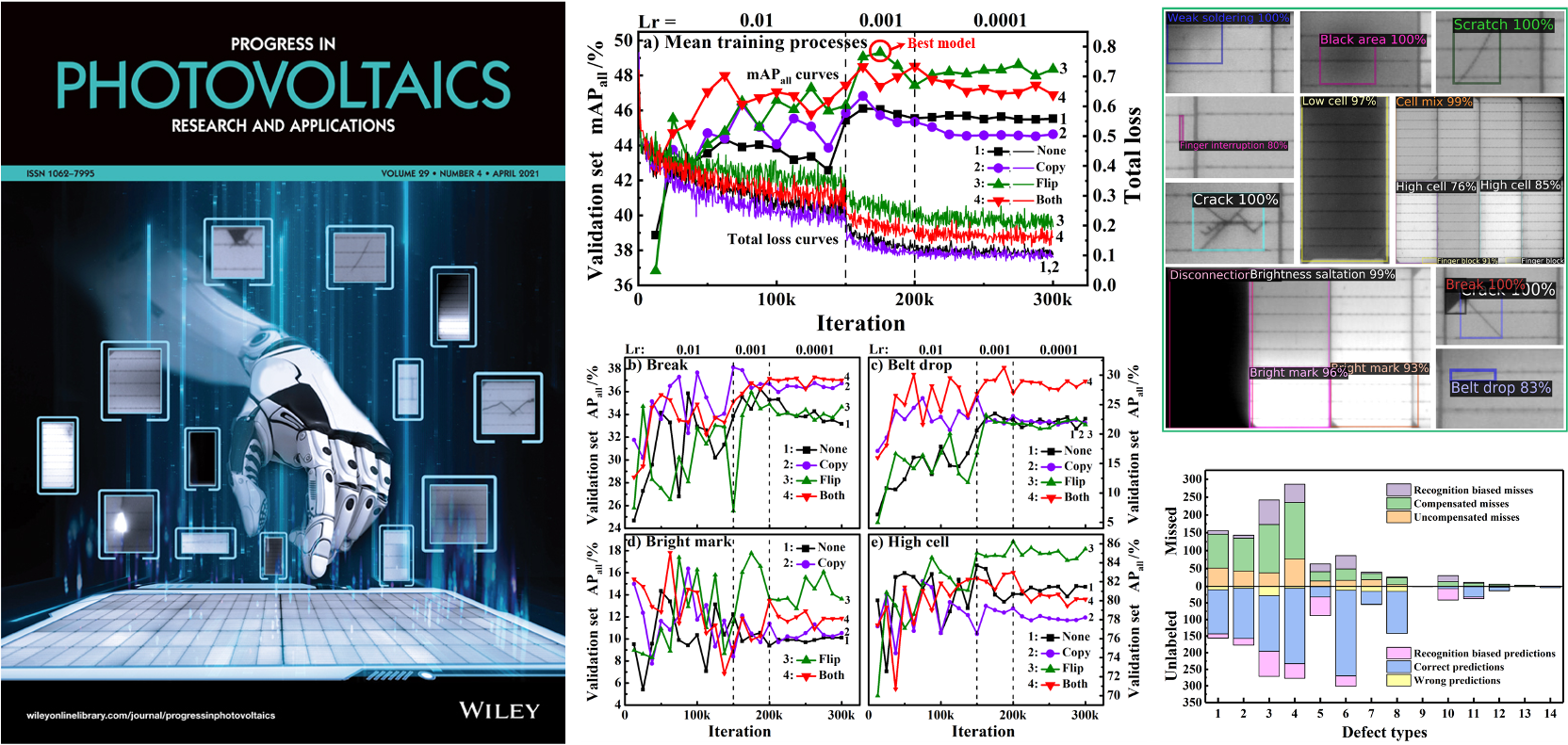最新一期的国际光伏科学与技术领域最高水平学术刊物《光伏研究及应用进展》【Progress in Photovoltaics: Research & Applications 29, 471-484 (2021)】以封面论文形式报道了Bevictor韦德太阳能研究所沈文忠研究组对光伏组件生产线上的多种缺陷实现高精度自动检测方面的研究成果。全文参见:https://onlinelibrary.wiley.com/doi/abs/10.1002/pip.3395。