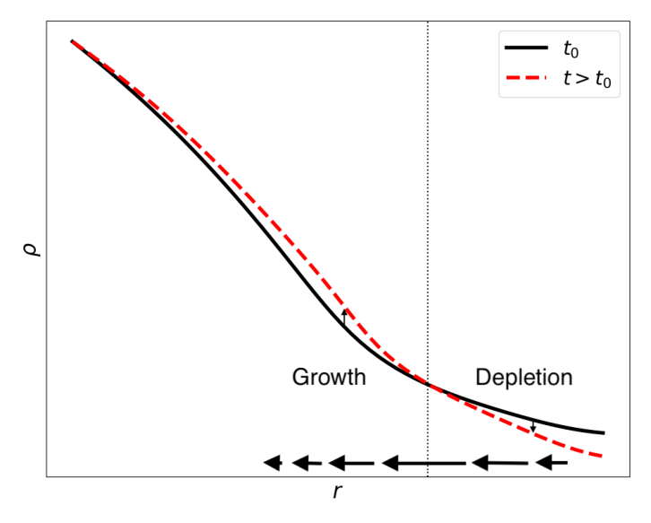 图3. 暗晕周围密度分布的演化方式的示意图(从实线向虚线演化)。横轴为到暗晕中心的距离,纵轴为该距离处的物质密度。在内耗竭半径以内,密度随时间增长;该半径以外,密度随时间下降,即暗晕周围物质逐渐被耗尽。 |