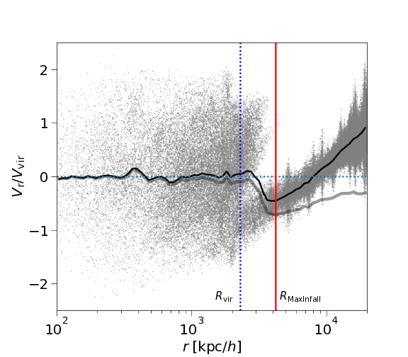 如何更明确的展示这一吞噬过程呢?我们可以研究暗晕周围的物质运动。当我们检查这些暗晕周围物质掉落进暗晕的内流速度时,我们发现在这一特征耗竭半径附近,物质的内流速度也是最大的!