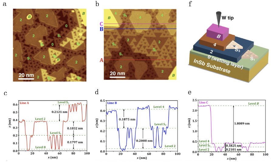 用分子束外延生长技术,通过沉积金属铋(Bi)到锑化铟(InSb)衬底表面上,贾金锋课题组成功地获得了具有谢尔宾斯基三角形结构的铋薄膜(见上图),这是世界上首次在实验中生长出单一元素原子构成的谢尔宾斯基三角形结构。他们使用高分辨率扫描隧道显微镜(STM),将样品表面从低到高区分为0、S1、2、S3、4和B不同高度区,其中S1和S3即为谢尔宾斯基三角形结构,同时他们还对样品表面的不同区域的形貌和电子性质做了详细表征。