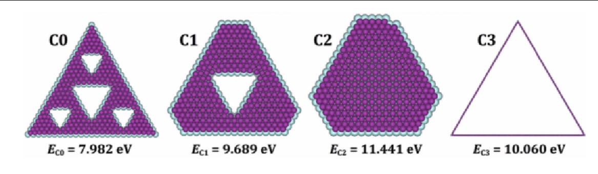 理论模型预言图中铋的谢尔宾斯基三角形结构(C0)相对于其它可能的典型结构(C1、C2、C3)是最稳定的(即能量上最低),与实验观察完全一致。