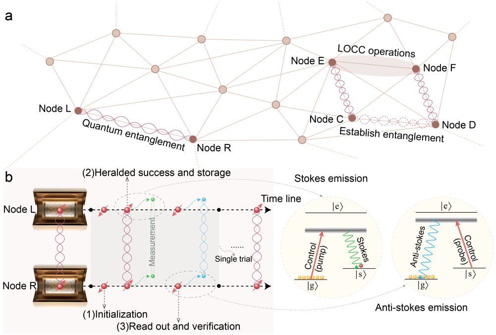 文章配图:室温量子网络节点示意图。(a)量子网络概念图 (b)室温量子节点建立纠缠流程图