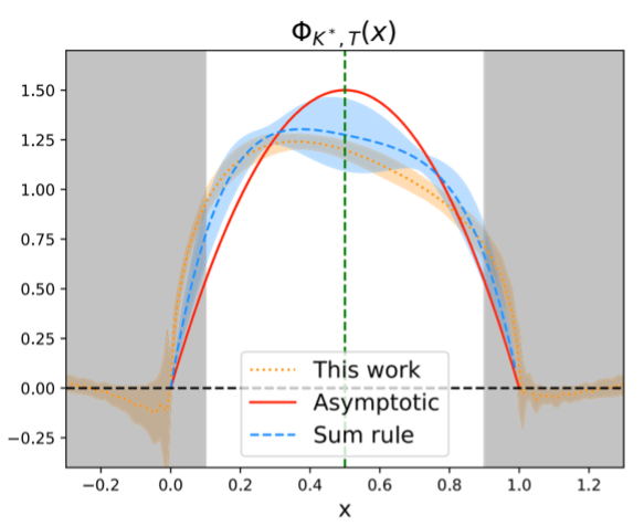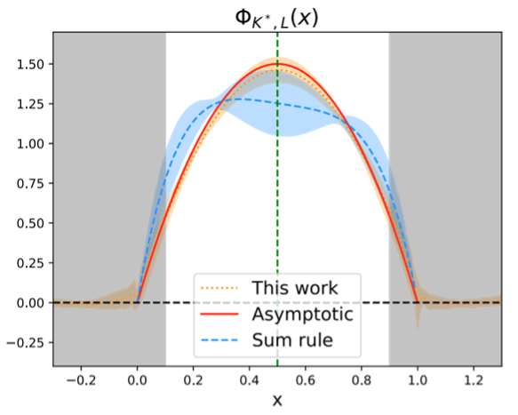 近日,王伟课题组所在的LPC合作组使用格点量子色动力学(QCD)方法,基于大动量有效理论(LaMET)框架,在MILC合作组具有物理夸克质量参数的三个格距的规范组态(最大规模963x192)上,系统地计算了含有一个轻夸克和一个奇异夸克的矢量介子K*和ϕ的准LCDA,并基于大动量与连续外推与解析计算,得到了对LCDA的第一性原理预言。由于轻夸克与奇异夸克的质量差,横向极化的K*介子的LCDA具有显著的不对称性(左图);但是类似的不对称性却未在径向极化的K*介子的LCDA中观察到(右图)。该研究是在基于LaMET的格点QCD计算中,目前唯一在具有物理夸克质量参数的多个格距的格子上完成计算、并进行连续外推的结果。研究论文已于近日发表在Phys. Rev. Lett.。