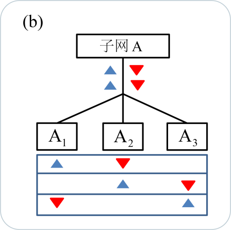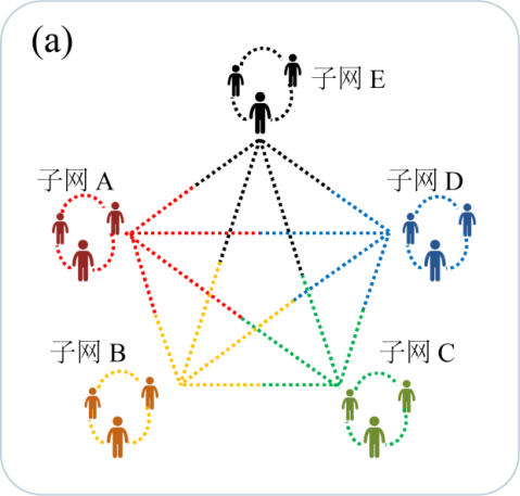 量子网络组成 (a)由五个子网完全连接的量子网络;(b)子网中三个用户之间的互联