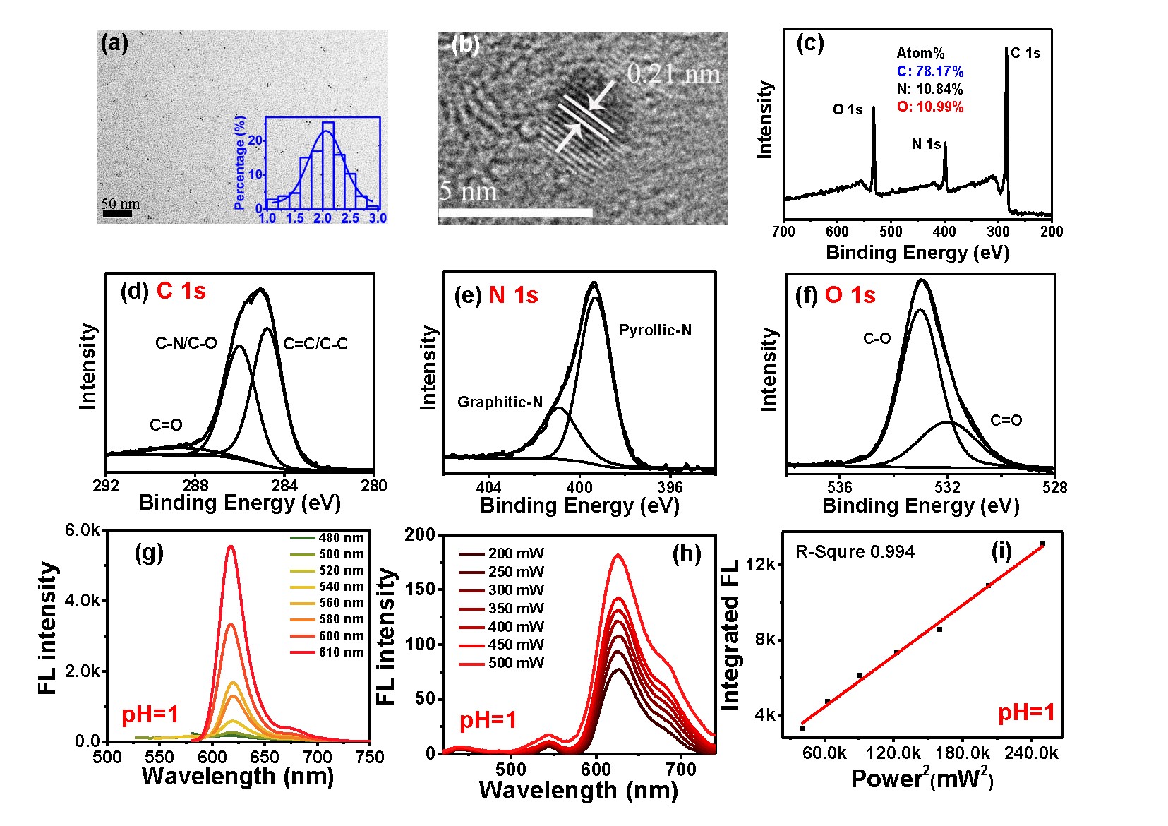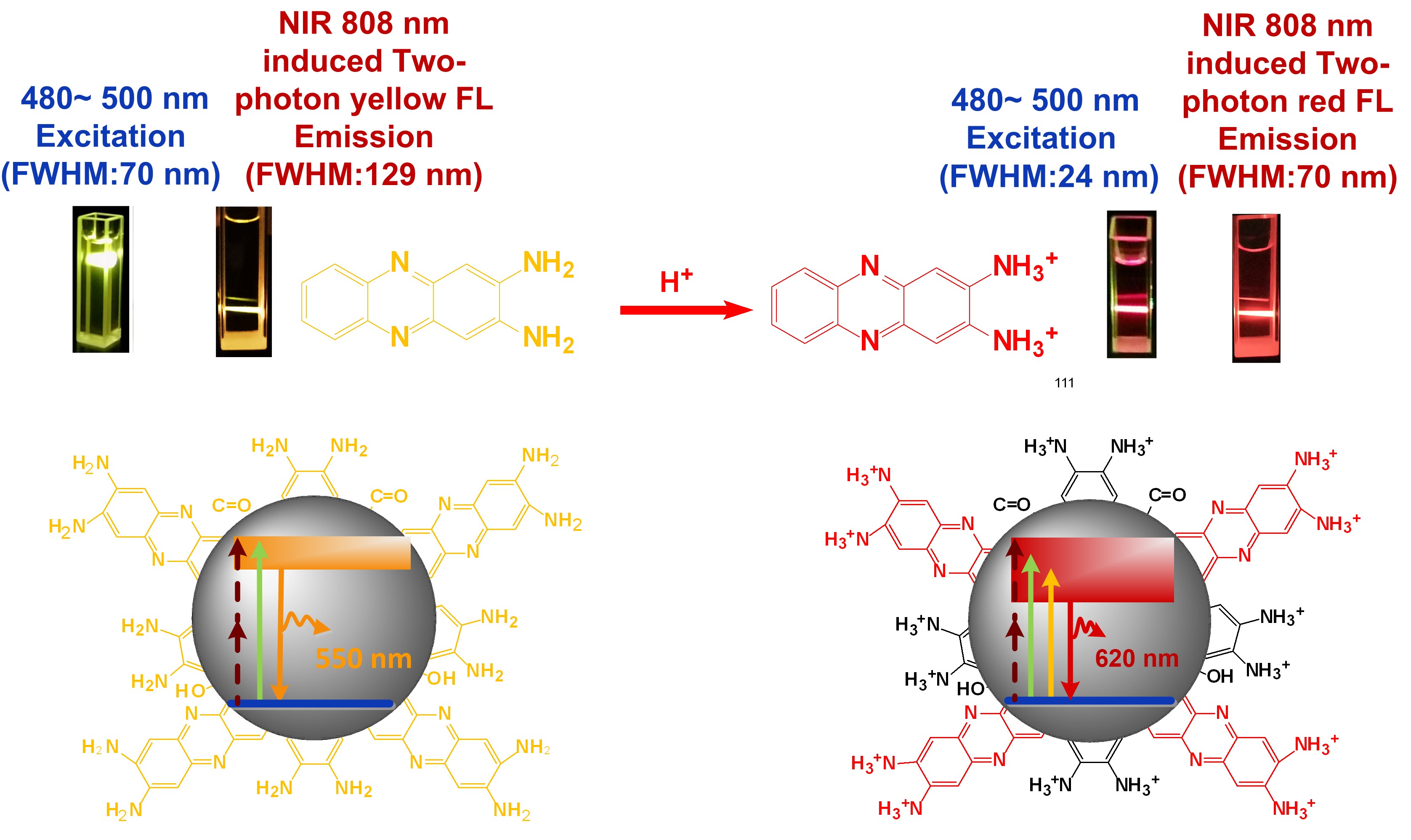 图1.氨基质子化引发碳量子点能隙变窄,导致单、双光子荧光发光波长红移及荧光峰宽变窄.