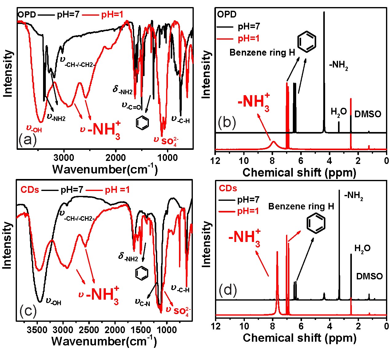 图 3. 邻苯二胺(o-phenylenediamine,OPD)及碳量子点 (Carbon Dots, CDs) 质子化过程中的傅里叶红外光谱(FITR)及核磁共振氢谱(H1 NMR)的对比.