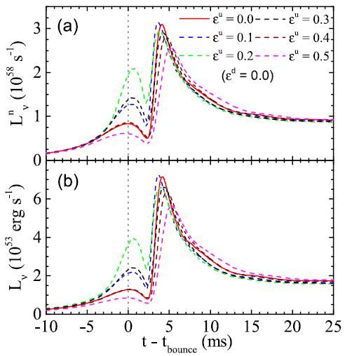 图1 使用不同中微子-夸克超标准模型相互作用时,一个15倍太阳质量的超新星演化过程中总的中微子数目通量(a)和能量通量(b)随时间的演化(tbounce为超新星塌缩反弹时间)。前面的峰对应前激波中微子爆,后面的峰对应激波突围中微子爆。