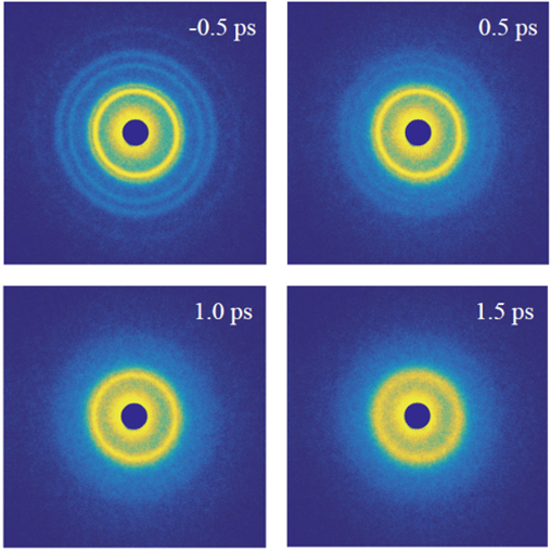 当强激光与材料作用时,电子温度会迅速上升并通过电子-声子耦合将能量传递给晶格;伴随晶格的温度升高,原子的振动幅度会增加。当原子的振动幅度大于约0.1倍晶格常数时,晶格间的结合力就无法把原子继续聚集在一起。此时,样品会熔化,发生从有序晶体态到无序液态的超快相变。实验中发现,当电子束相对于激光的延时为0.5皮秒(1皮秒=10-12秒)时,衍射环强度已经明显变弱,预示着样品已经开始失去长程有序性;当延时增加到1皮秒时,衍射环完全消失,说明铝在1 皮秒内就已经熔化为液态。