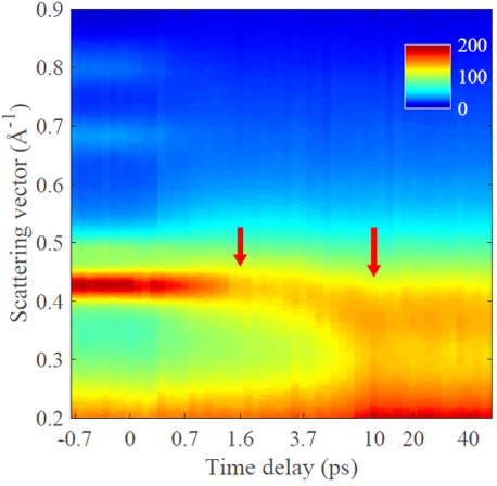由于铝的液态密度低于固态密度,因此铝在刚熔化时仅仅是失去了原子间的长程有序性,会短暂地处于具有固态密度的高密度液态中间态,之后还需要经过约10 皮秒的时间从高密度液态演化为低密度液态。利用高时空分辨的衍射斑径向函数演化图,可以完整地观察到此过程及相应的原子间短程序的变化。
