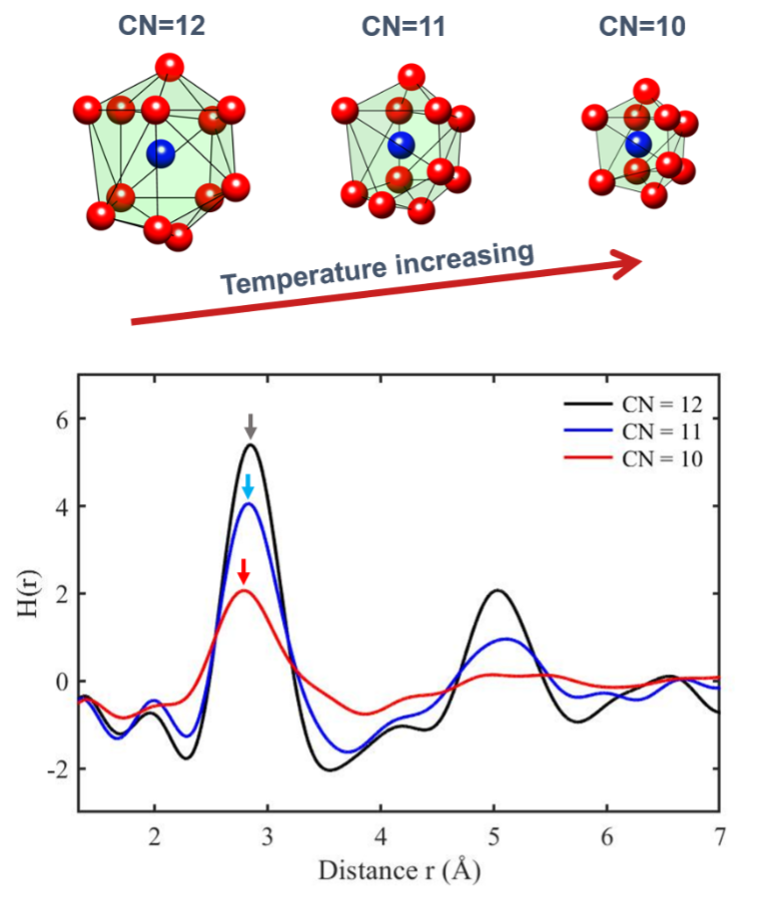 经过超快熔化过程之后,材料一般处于过热液态(温度高于沸点)。进一步的研究表明,与宏观上的热胀冷缩相反,随着温度增高,过热液态下的金属团簇会发生热缩冷账的“负膨胀” 现象:团簇中的最近邻原子由于其动能的增加而脱离中心原子的束缚,该中心原子的配位数(CN)会减少;低配位数团簇由于更强的结合力会导致中心原子和近邻原子的间距缩短。“负膨胀” 现象可通过原子径向分布函数第一个峰的位置进行研究,实验中发现该峰的位置在1000-6000度的范围内均随温度增高而逐渐变小,与分子动力学理论模拟结果符合较好。利用超短脉冲激光产生转瞬即逝的平衡态下难以研究的物态(如高达6000度的过热液态等),并结合超快电子衍射技术对这种状态下的结构演化进行探索,对于理解极端条件下的液态性质和玻璃态转变等过程有着重要意义。