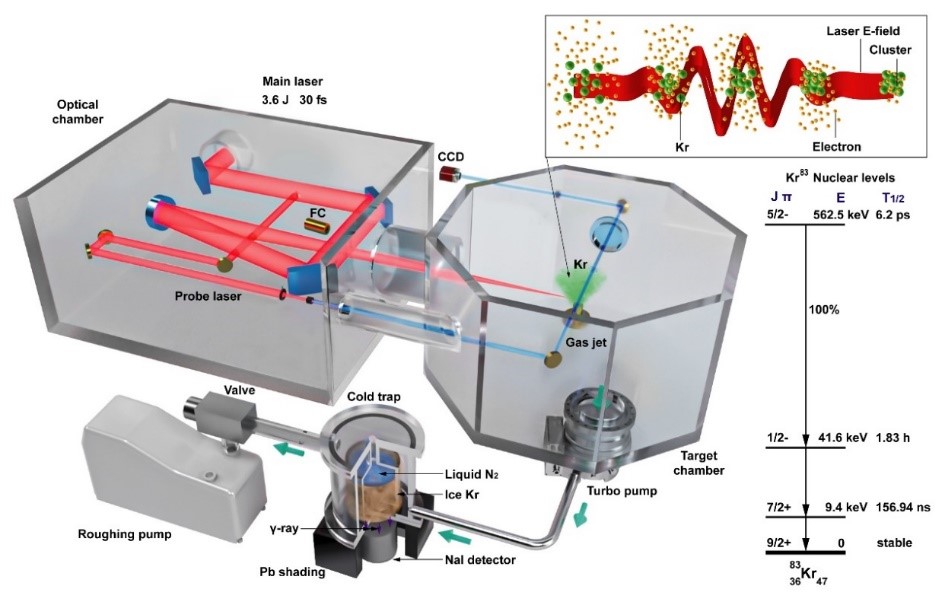 核同质异能态是指具有相同质子、中子数的原子核所处的激发态,相应的这些元素互称为核同质异能素,今年又恰逢核同质异能态被发现100年。核同质异能态的高效激发对于诸如核时标、核电池、清洁核能和核γ射线激光等开创性应用至关重要。然而,由于微小的核激发截面和快速衰变这两个特点,很难通过传统的加速器或反应堆这些较低峰值密度的核激发装置积累大量短寿命的同质异能素,这就成为同质异能素应用领域最大的瓶颈问题。
