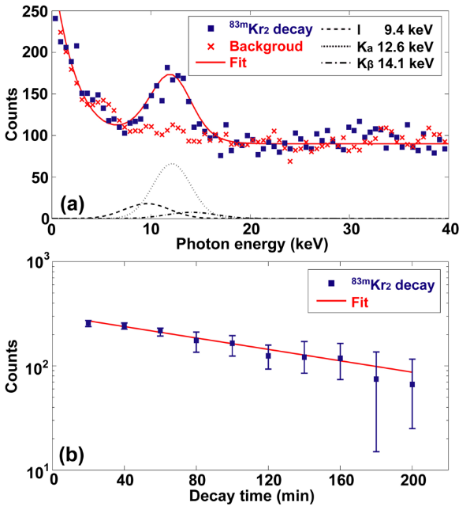 图 2. (a) 同质异能态退激释放的X射线谱;(b) 随时间衰变的产额及半衰期拟合。