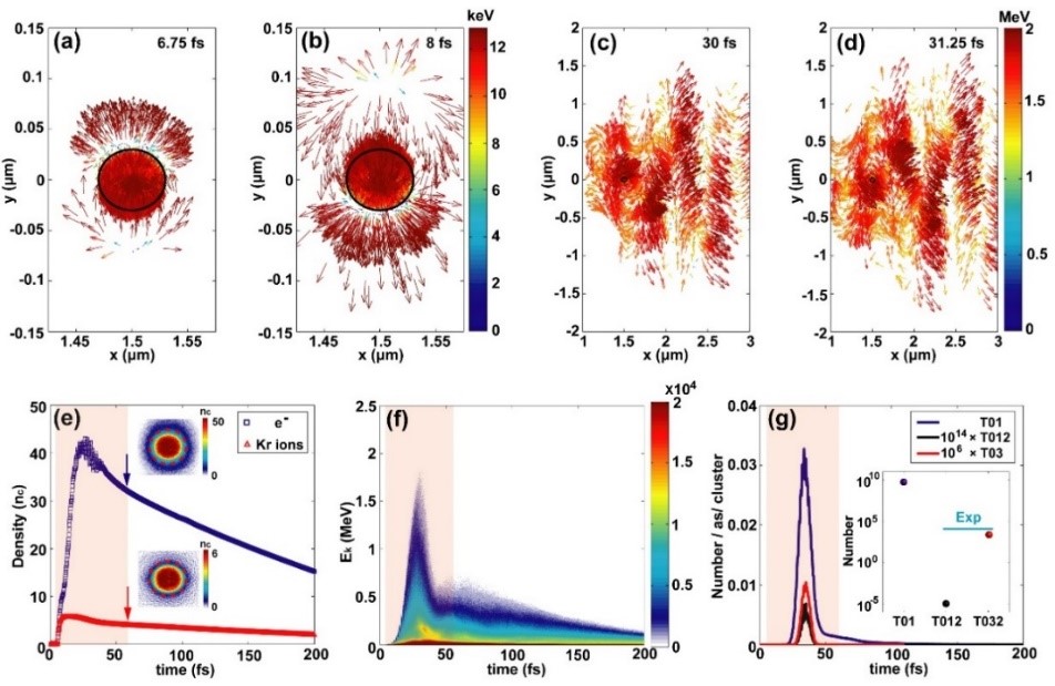 图 3. 激光团簇作用的PIC模拟及库伦激发计算。(a-d) 不同时刻激光团簇作用的电子分布;(e) 团簇区域电子、离子密度随时间的演化;(f) 团簇区域电子能量随时间的演化;(g) 各个激发路径的激发效率及产额。