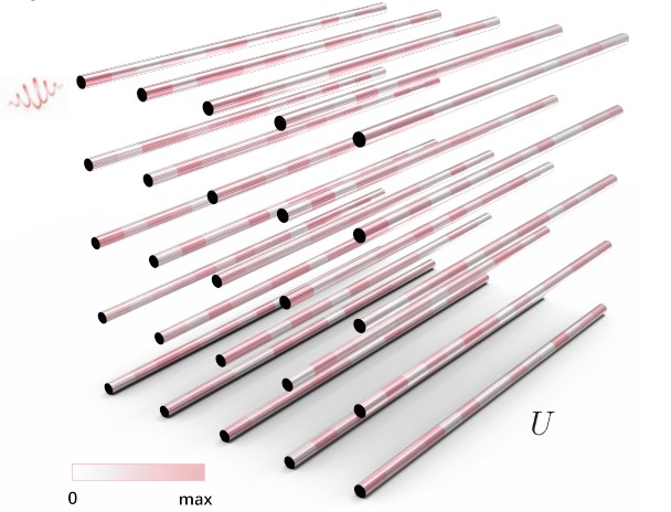 图1 三维光子芯片上的波导阵列示意图 不同深度的颜色代表不同强度的波导传输常数的扰动值△β。