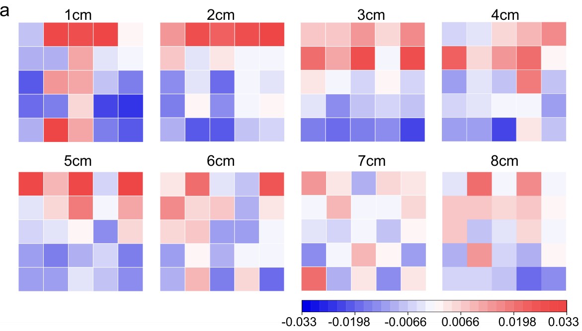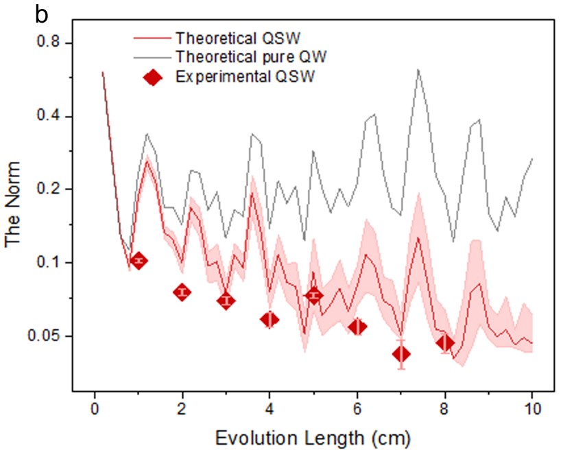 实验中制备多达17组不同△β随机扰动的5×5三维光波导阵列,每组包括1-8厘米共8种不同的演化长度的样品。所有这百余个样品中△β随机扰动值直方图都满足0-0.4/mm的均匀分布,在每段△z为2毫米的片段内维持恒定的△β随机扰动值。实验获得量子随机行走的光子演化分布图像,获得同等演化长度下17组的平均演化分布,与完全均匀分布进行比较,获得二者分布差矩阵的范数,因为符合哈尔测度时演化分布的期望将为均匀分布。实验证明,大约8厘米的演化逐渐符合哈尔测度(范数趋向于零),这和理论模拟结果相一致。对于不加传输常数扰动的纯量子行走,则范数无法减小,体现了量子随机行走构建哈尔随机酉矩阵的特有优势。