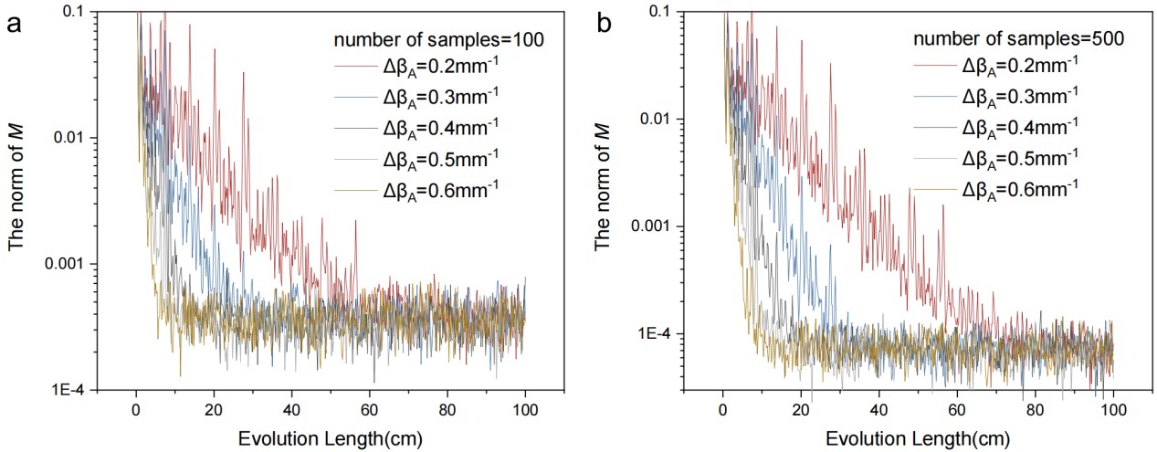 在此基础上,此项工作还通过补充实验以及数值模拟探究了影响收敛时间和收敛极限的因素。研究表面,△β幅度的增大会加快范数收敛的速度,而样品组数的增加则会提升收敛的精度(即稳定于更低的范数),还有体现随机扰动变化频率的参数△z也会影响收敛速度。在现有的光量子芯片技术内,通过选择合适的实验参数,可以完全实现符合哈尔测度的随机酉矩阵。