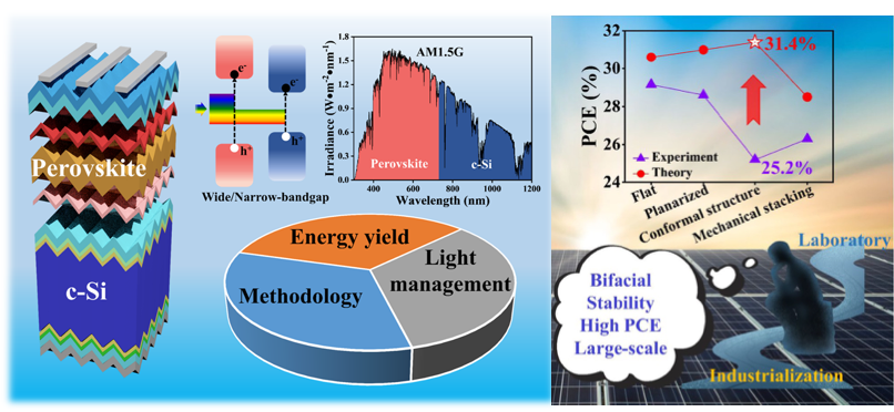 同时应邀在碳中和领域首本综合性国际学术期刊【Carbon Neutrality 1, 9-(1-16) (2022)】首期上综述了钙钛矿/晶硅叠层太阳电池数值仿真领域的进展,系统探讨叠层电池的模拟方法、光管理和能量产出。在模拟方法部分,总结了当前太阳电池数值计算方法的三大进展,包括方法集成、建模优化和参数校正。对于光管理,指出绒面结构对于单结和双结电池都是有益的,并创新性地说明了准保形结构可以获得与保形结构非常相似的光学特性,此外准保形结构还有利于钙钛矿的制备。对于能量产出话题,创新性地指出,天气、地点和时间等影响钙钛矿/晶硅叠层太阳电池能量产出的根本原因是光谱变量。在双面情况下,还需要考虑由反射率和钙钛矿带隙造成的电流失配损失。