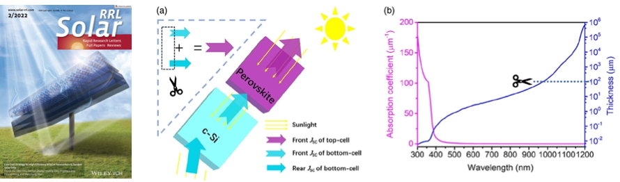 课题组在【Solar RRL 6, 2100781 (2022)】以封面论文形式发表了双面钙钛矿/晶硅两端叠层太阳电池性能优化与能量产率提升的研究成果。论文优化了不同晶硅厚度、金字塔绒面高度和太阳光反照率下双面钙钛矿/晶硅两端叠层电池的光伏性能。研究发现,晶硅底电池的厚度可以从目前的250微米降低到25微米,只需增加18.6%的反照率即可弥补吸收损失。论文指出100 微米厚的晶硅是合适的选择,并优化了硅金字塔的尺寸 (1微米)以获得出色的光捕获性能。进一步的双面钙钛矿/晶硅两端叠层太阳电池能量产率计算发现,在取得匹配的太阳光反照率后,反照率增加对双面钙钛矿/晶硅叠层太阳电池能量输出的贡献几乎可以忽略不计。论文工作对双面钙钛矿/晶硅两端叠层太阳电池的开发提供基础。