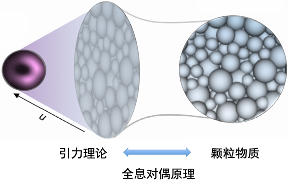 引力全息对偶(也称规范/引力对偶、AdS/CFT 对应)由物理学家Maldacena在1997年具体提出,是现代物理中最深刻的理论进展之一。该对偶性可以把难以解决的低维空间的物理问题映射到容易处理的高维引力体系,反之亦然。这种不同维度空间的对应类似“全息投影”技术,因而得名。虽然最初来自超弦理论,全息方法目前已经被广泛应用到量子色动力学、凝聚态物理和量子信息等领域的研究,取得了很多重要成果,例如全息对偶从理论上得到的强耦合的夸克-胶子等离子体的粘滞系数与熵密度的比值与实验值十分接近。