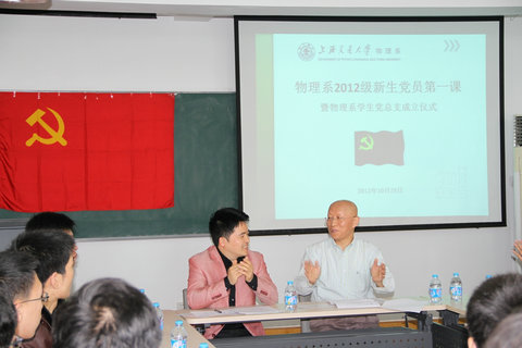 10月24日下午1点,物理系在物理楼611报告厅举行2012级新生党员第一课暨举行物理系员工党总支成立仪式。系党委书记叶庆好,系党委副书记、员工党总支书记蒋立峰,辅导员张亮、王潭潭,各党支部书记以及2012级新生党员出席。仪式由蒋立峰主持。