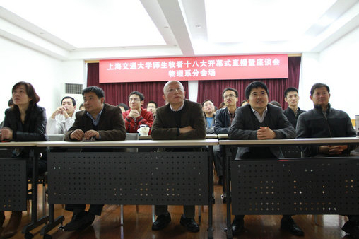 2012年11月8日九点整,中国共产党第十八次全国代表大会在北京隆重召开。上海交大物理系师生在物理系616室同步观看了开幕式,并认真聆听了胡锦涛总书记的工作报告。在场收看开幕式的有物理系党总书记叶庆好、常务副系主任陈险峰、系党委副书记蒋立峰、系党办公主任王晓红、以及各教工支部书记和员工共五十余人。