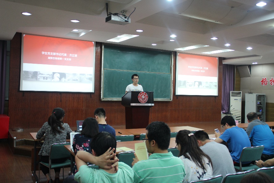 最后,两位员工党员同学作为代表进行了发言,讲述自己对于“两学一做”的认识以及一些学习的心得。物理与天文系凝聚态所研究生第一支部的党支书方立波认为,“两学一做”是向经常性教育延伸的典型,是落实党章关于加强党员教育管理要求、面向全体党员深化党内教育的重要实践,是推动党内教育从“关键少数”向广大党员拓展、从集中性教育向经常性教育延伸的重要举措,是加强党的思想政治建设的重要部署。国防生支部的代表李豪卿认为“两学一做”中的内容既是对以往合格党员要求的一脉相承,同时也是新时期我们作为合格党员应具有的政治标准、道德标准、纪律标准、行为标准的深刻概括,这也将成为规范和衡量党员的基本尺度,是我们知行合一的行动指南。