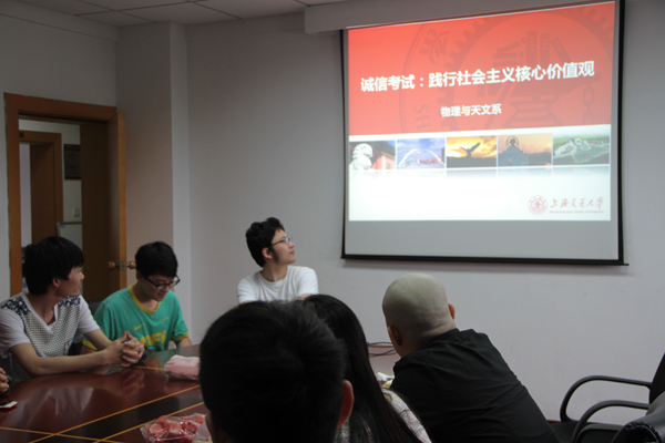 6月15日下午,物理与天文系在物理楼610会议室开展了“诚信考试:践行社会主义核心价值观”为主旨的思想教育活动,会议由物理与天文系团委书记梁钦老师主持,辅导员何川以及各班级班长、团支书出席了此次会议。
