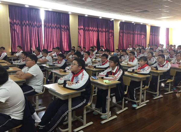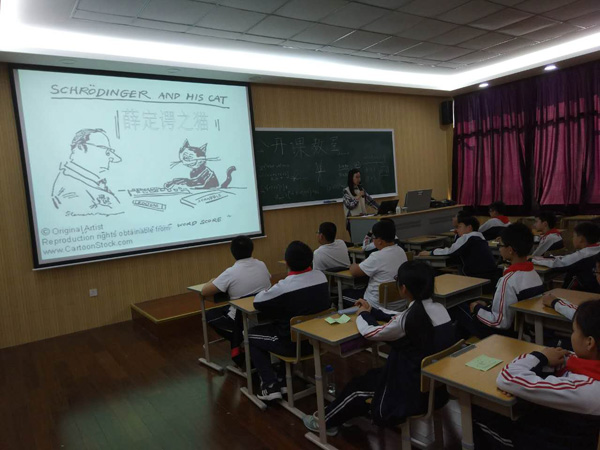 活动结尾,科学讲师们为上宝中学的员工播放了小视频:“薛定谔和他的猫”。同学们被视频中有趣的描述深深吸引,不时发出笑声,气氛欢快热烈。本次活动为该校员工提供了一次探索科学原理,启发科学兴趣的机会,为同学们开启了探索量子世界的大门。