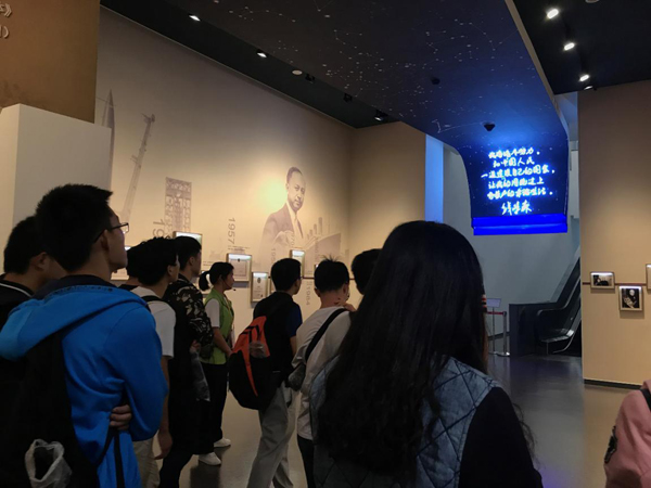 钱学森图书馆的建筑外形采用了“大地情怀,石破天惊”的设计理念,高度契合了钱老对祖国的深沉热爱与对“两弹一星”的杰出贡献。在讲解员的带领下,同学们首先观看了钱学森纪录片。在影片中,同学们看到了钱老是如何在自己的全盛时期放弃一切,从美国回到中国;又是如何放弃了自己的科学研究,一心投入到中国航天事业的奋斗中去。
