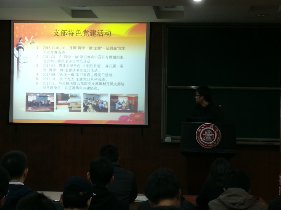 活动一开始,Bevictor韦德光学所第一研究生党支部副支书傅其栋与本科生党支部支书俞祖卿从支部建设、支部管理及支部活动方面分别对各支部情况做了相关介绍,为本次活动顺利开展打下基础。