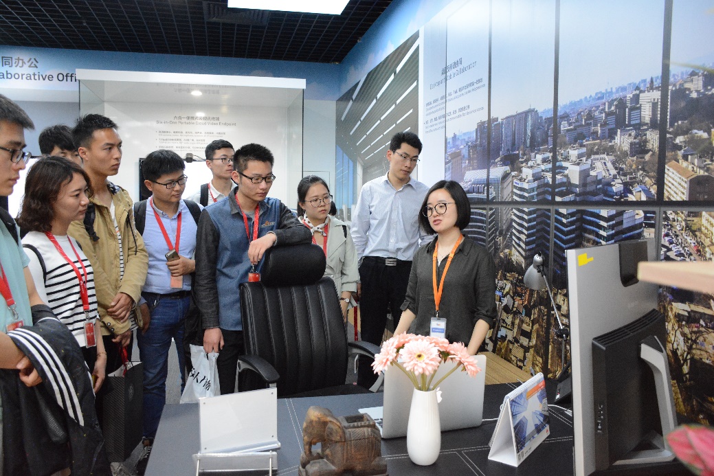 接下来,物院师生参观了华为公司的通信设备体验中心。讲解员从全球首款全景智真到4K超清视频会议、再到六合一便携式云视讯终端,介绍了华为的企业协同办公,也让大家熟悉了解了一站式企业通信云服务和ICP融合指挥解决方案。