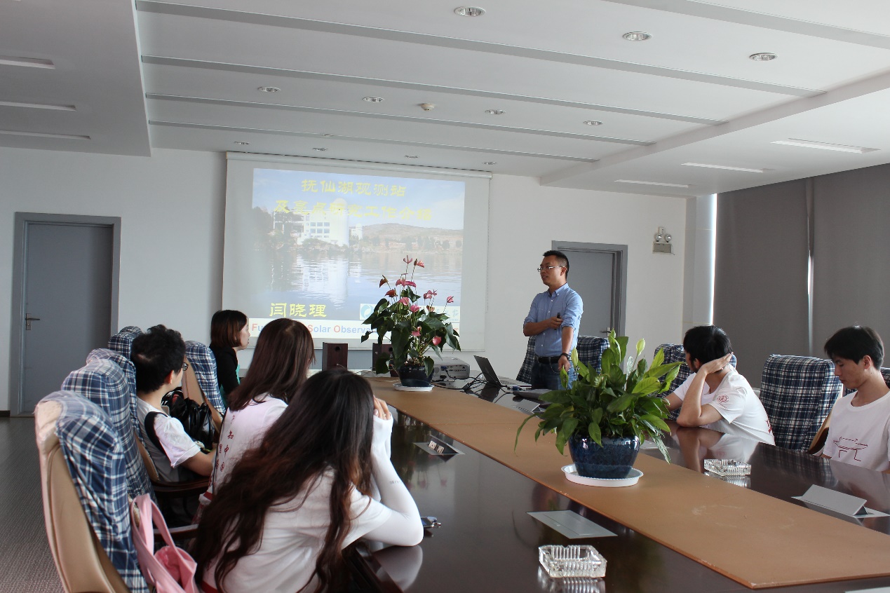 当天下午,同学们马不停蹄,奔赴位于抚仙湖畔的云南天文台抚仙湖太阳观测站。下午的报告由抚仙湖观测站的闫晓理研究员主持,首先为同学们简要介绍了抚仙湖太阳观测站的基本情况,之后讲述了他以及他所带领的科研团队近年来在太阳物理方面取得的一些重要成果和研究亮点。同学们也对报告提出了问题,例如观测条件等,闫研究员一一给予回答。