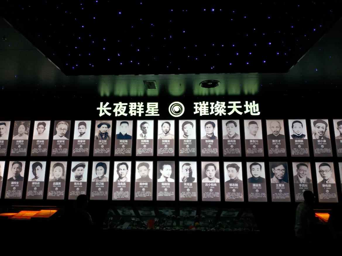 行至纪念馆的出口处,一面巨大的照片墙映入同志们的眼帘。讲解向同志们讲述了其寓意:“在中国革命处于低潮的日子里,有成千上万的共产党员献出了生命,他们中大多数人并未留下详细的事迹,有的留下的只是一个照片,有的留下的只是一个名字,而有更多的人连名字或照片都没有留下。而在这面照片墙的上方,流动播放着烈士们的照片,而那些没有照片、没有姓名的烈士,就化作长夜里的群星,照耀着共产主义事业前行的道路。”