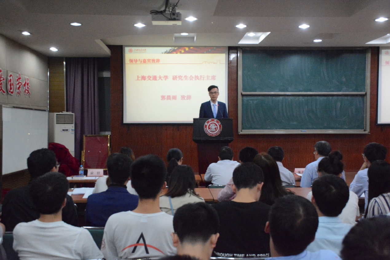 紧接着,校研究生会执行主席郭晨雨致辞,他首先代表校研究生会对公司研究生代表大会的召开表示祝贺;随后简单回顾了过去一年里物院研会的工作成果,并对物院研会做出的的贡献给予了充分肯定;最后寄语新一届物院研会,希望他们能够继承往届的优良传统,更好地服务师生。