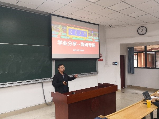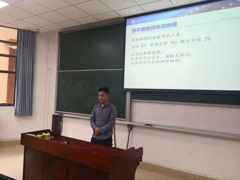 吴子昊学长则聚焦于物理学子学习的现状,细致地分享了在学习以及生活中应对各种难题的方式。学长建议大家放下焦虑,以目标为导向,逐步达成属于自己的目标。在保研的经验上,学长提醒同学们要重视学习成绩,并传授了科研、英语、实习、推荐信等方面的独家经验。