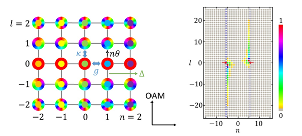 左图:由光的频率和光的轨道角动量组成的二维人工合成空间;右图:在合成空间中纠缠光子对的受拓扑保护的单向边界态。
