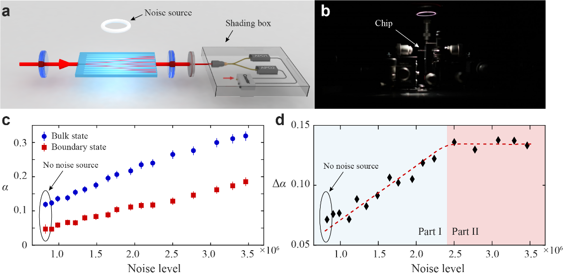 实验示意图(a)以及实际装置图(b)。(c)相比于体态中的光子,边界态中的单光子在噪音环境下始终能够保持相对较好的量子性质。(d)随着噪音水平的增加,实验展示了这种保护能力的最大潜能。