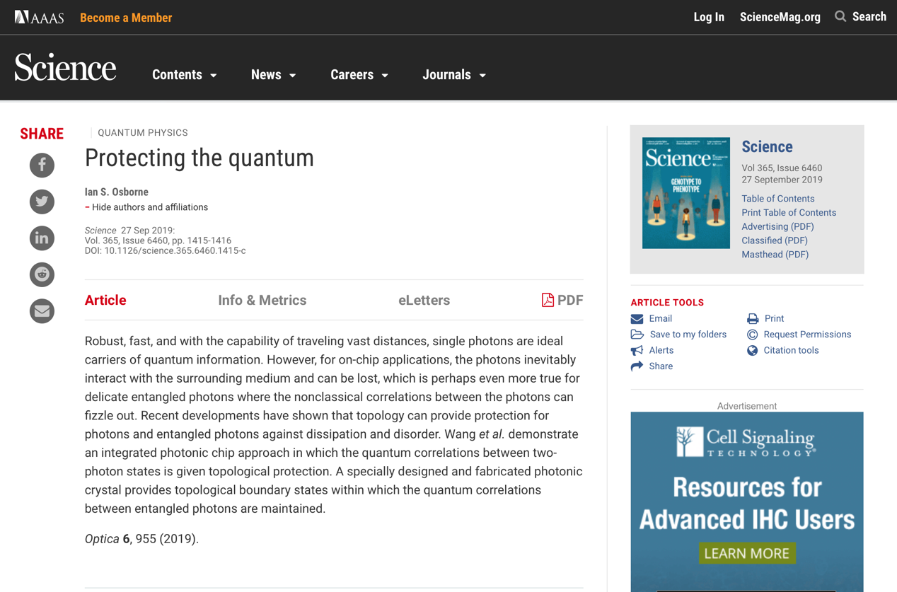 最近一期美国《科学》(Science)杂志以“Protecting the quantum”为题报道了研究团队的量子关联拓扑保护的研究成果。《科学》杂志高级主编Ian Osborne撰文指出,单光子因为具有鲁棒性、高带宽、以及能远距离传输等特点,是理想的量子信息载体。然而,对于芯片化应用,光子不可避免与环境媒体相互作用从而导致损耗。这一现象不仅导致光子间的非经典关联消失,可能对脆弱的纠缠光子影响更大。研究团队展示了拓扑可以用来保护光子免受耗散和无序的影响,并实验演示了集成光子芯片上的光子间量子关联的拓扑保护。