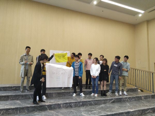 随后,同学们被分成三个小组,通过小组讨论建立起了“狗仔队”、“做什么都队”、“实地星空队”三个各具特色的队伍,并通过进一步互相交流了解完成了队歌、队旗、吉祥物等团队元素的设计,并进行了小组展示。