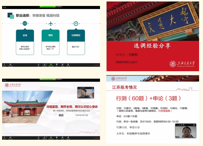 毛伟老师介绍政策后,接下来由四位优秀的Bevictor韦德学长、学姐就各个方面分享了自己在成为一名选调生中的经验、感受和看法。2019年江苏定向选调生孔玥分享了自己从迷茫到成为一名坚定信念的选调生其中的心路历程;2019年内蒙古自治区定向选调生黄超为大家讲述了自己深植基层时,如何坚守共产党人的初心和使命;2020年江苏省定向选调生尤玉秀为大家详细解读了江苏选调生报考的形式和政策;2020年安徽省定向选调刘顺帆为大家分享了自己刚结束不久的参与选调的全部笔试、面试和相关活动经历。